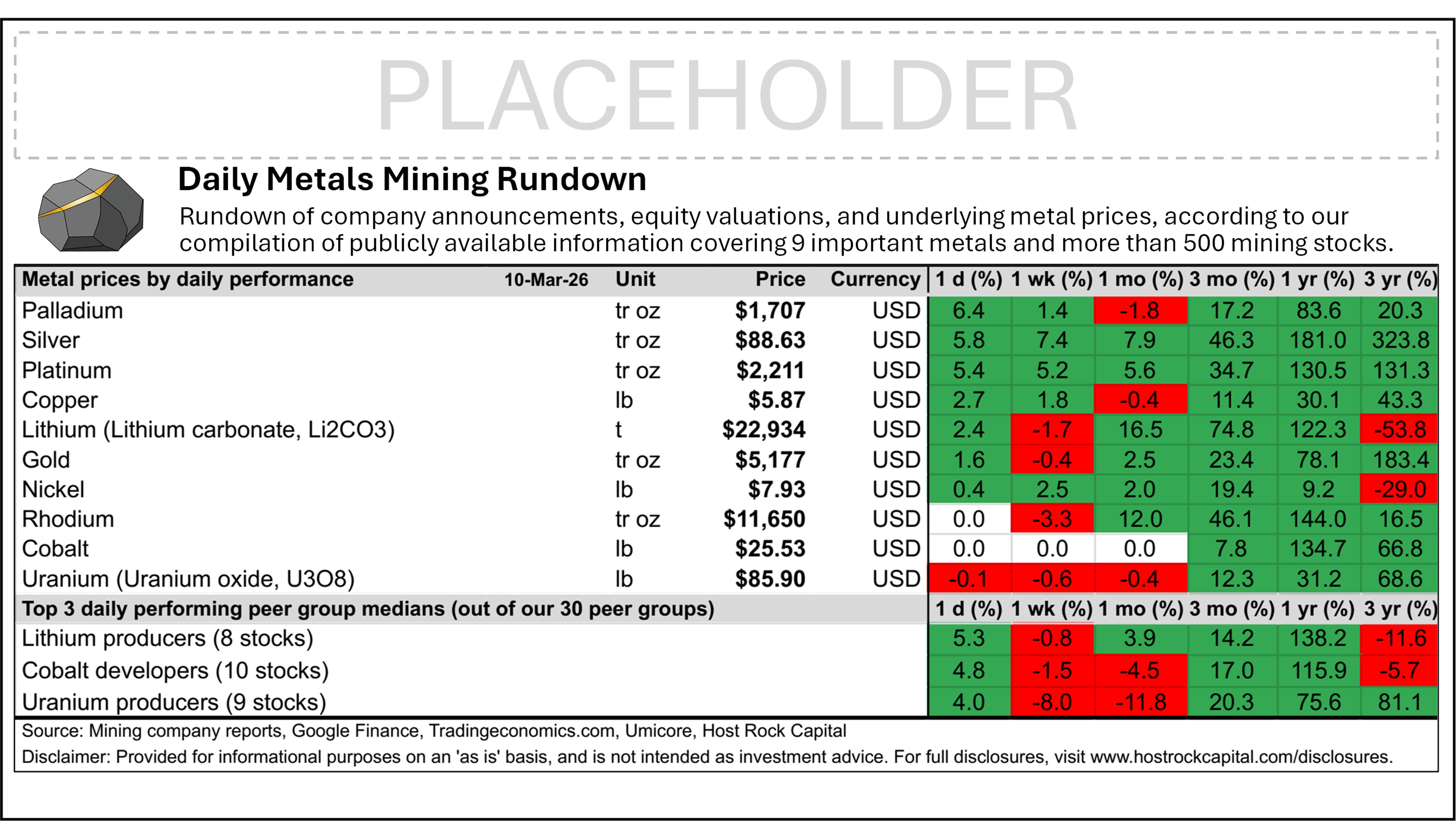 Includes: the same information provided in the Free Daily Metals Mining Rundown (metals pricing, peer group median price performance, peer group median valuations, and list of top and bottom 40 daily performing stocks showing associated peer groups), in addition to premium items such as the lists of individual stocks making up each peer group and their relative price performances, along with ranked valuation information (by market cap per unit resource for all 450+ stocks, and by P/NAV for 150+ developer stocks). Published and distributed up to twice daily, 3-5 days per week. Upgrade to a paid tier is required for access. For legal disclosures, visit www.hostrockcapital.com/disclosures.