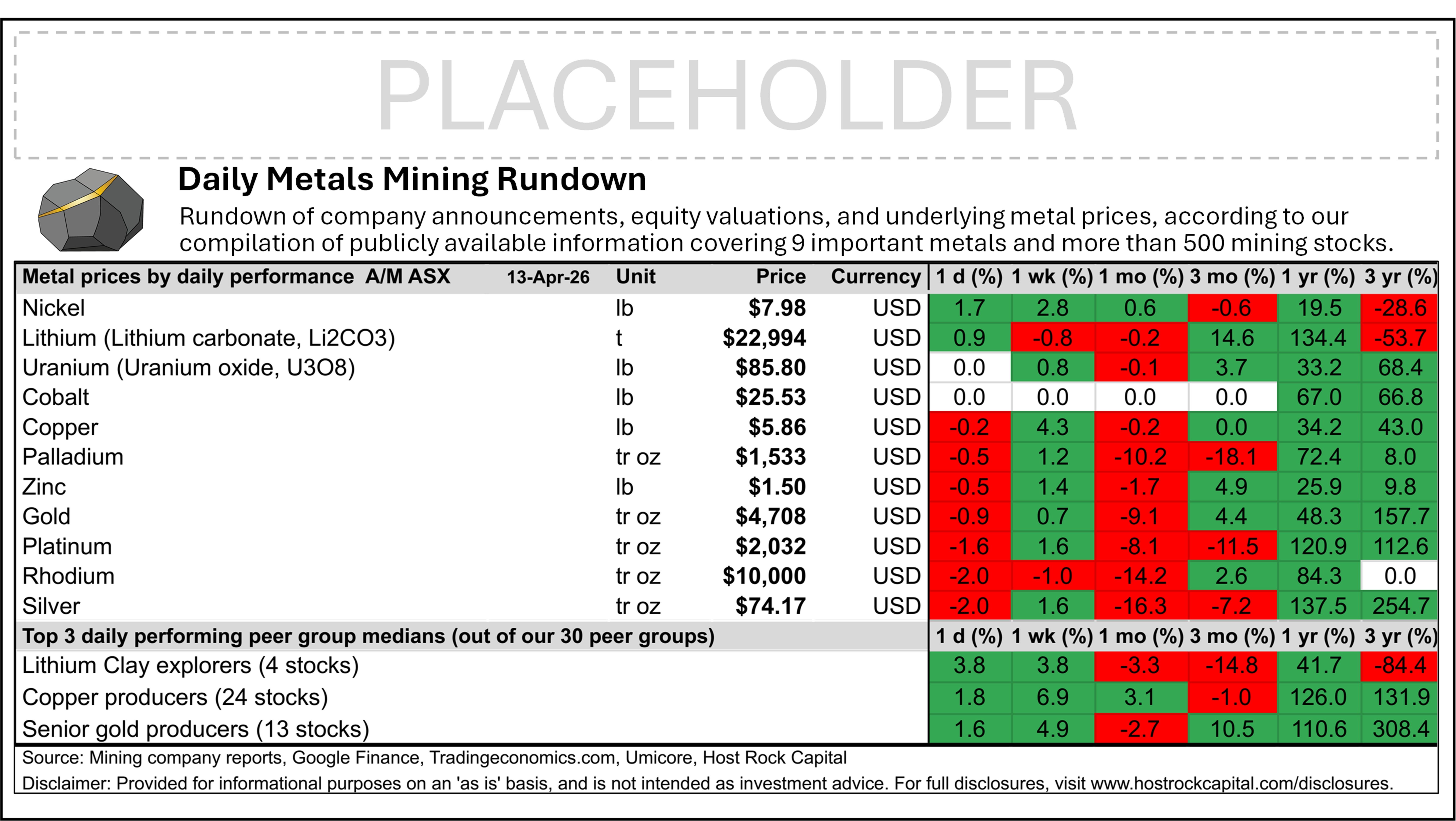 Includes: the same information provided in the Free Daily Metals Mining Rundown (metals pricing, peer group median price performance, peer group median valuations, and list of top and bottom 40 daily performing stocks showing associated peer groups), in addition to premium items such as the lists of individual stocks making up each peer group and their relative price performances, along with ranked valuation information (by market cap per unit resource for all 450+ stocks, and by P/NAV for 150+ developer stocks). Published and distributed up to twice daily, 3-5 days per week. Upgrade to a paid tier is required for access. For legal disclosures, visit www.hostrockcapital.com/disclosures.
