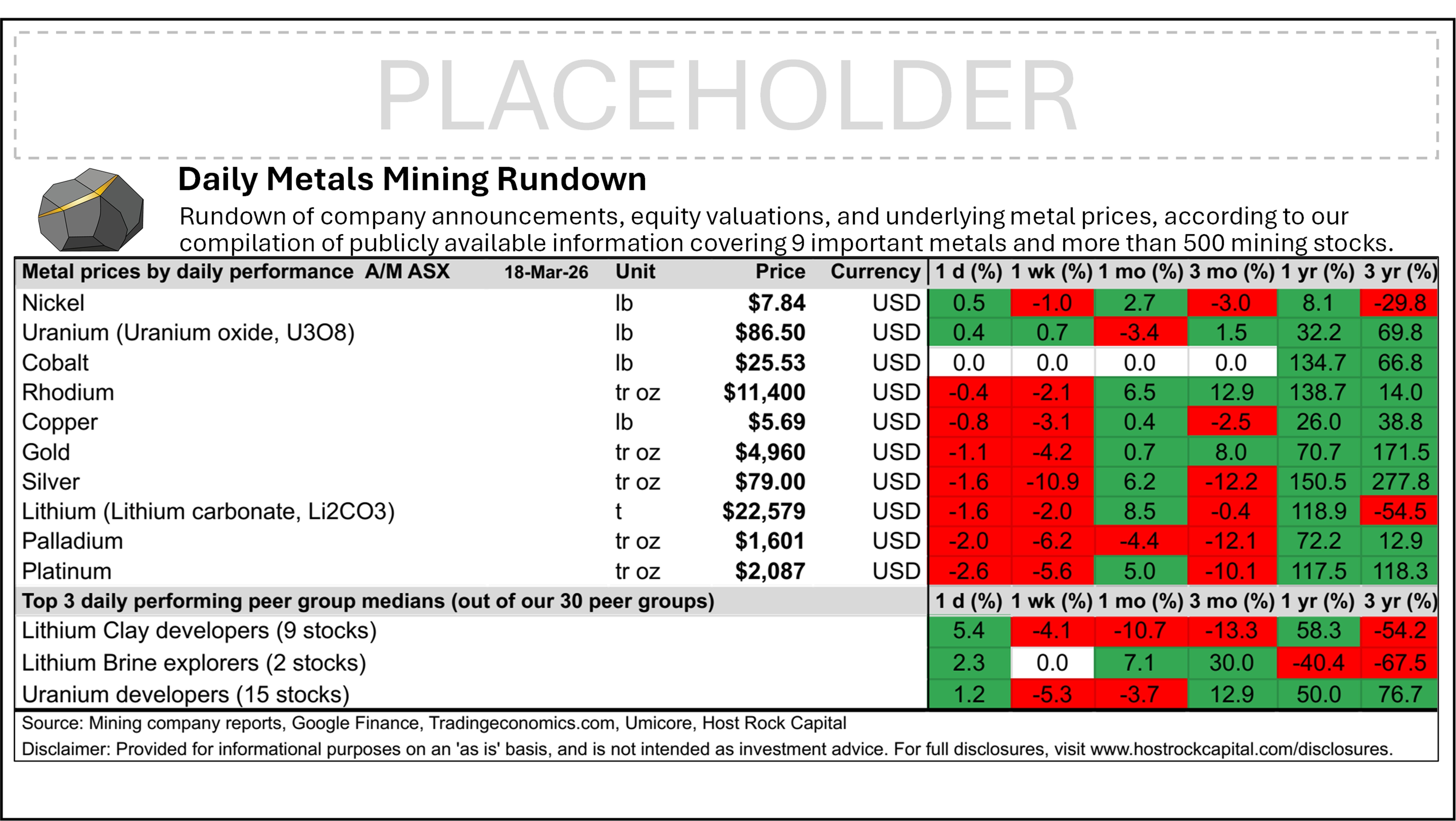Daily Metals Mining Rundown with Peer Table - Premium Edition for 18 Mar 2026 (after-market ASX)