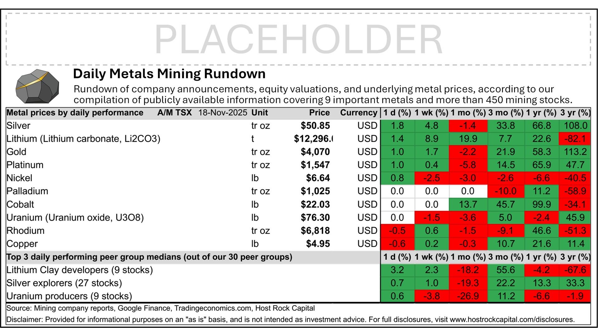 Daily Metals Mining Rundown with Peer Table - Premium Edition for 18 Nov 2025 (after-market TSX)