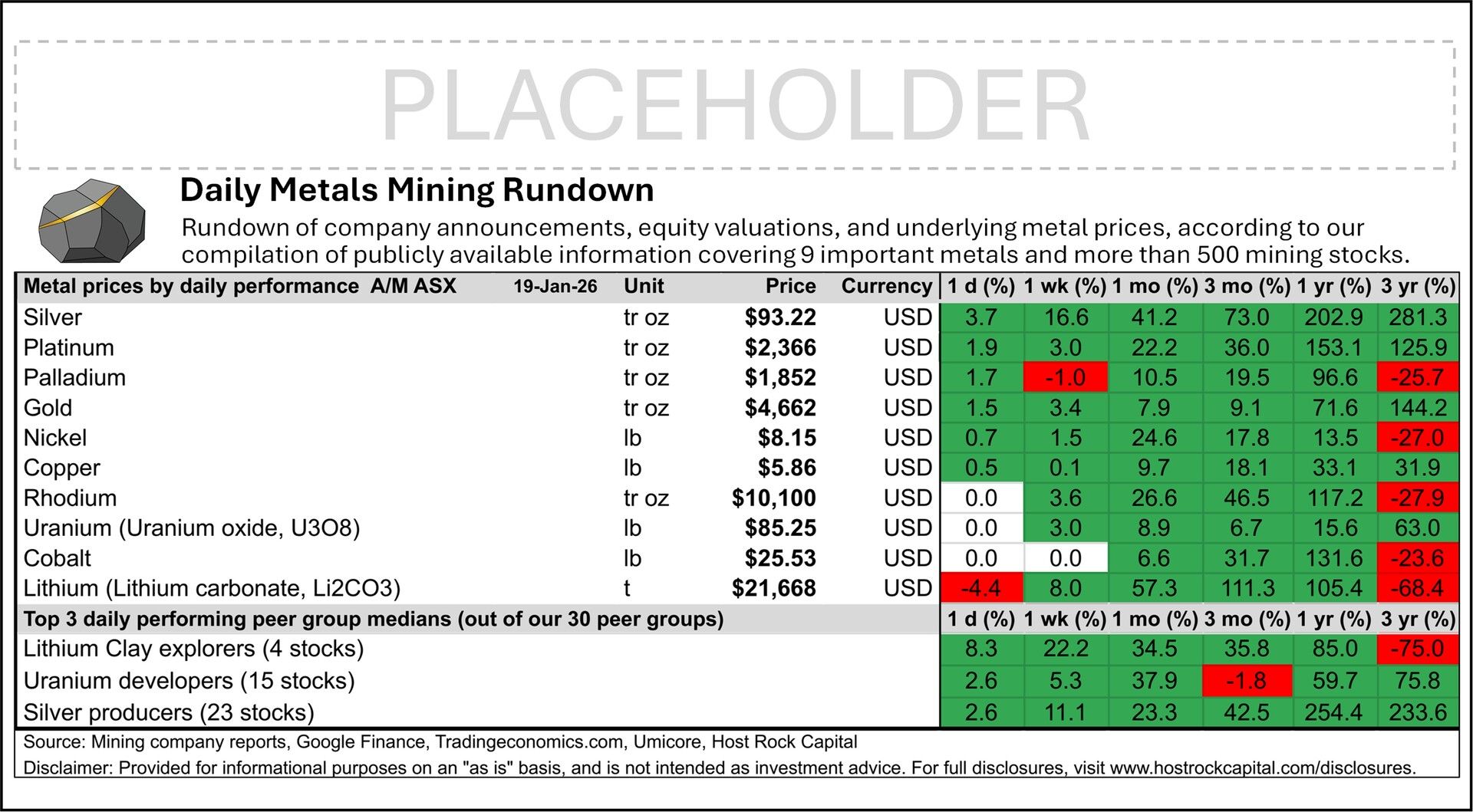 Includes: the same information provided in the Free Daily Metals Mining Rundown (metals pricing, peer group median price performance, peer group median valuations, and list of top and bottom 40 daily performing stocks showing associated peer groups), in addition to premium items such as the lists of individual stocks making up each peer group and their relative price performances, along with ranked valuation information (by market cap per unit resource for all 450+ stocks, and by P/NAV for 150+ developer stocks). Published and distributed up to twice daily, 3-5 days per week. Upgrade to a paid tier is required for access. For legal disclosures, visit www.hostrockcapital.com/disclosures.