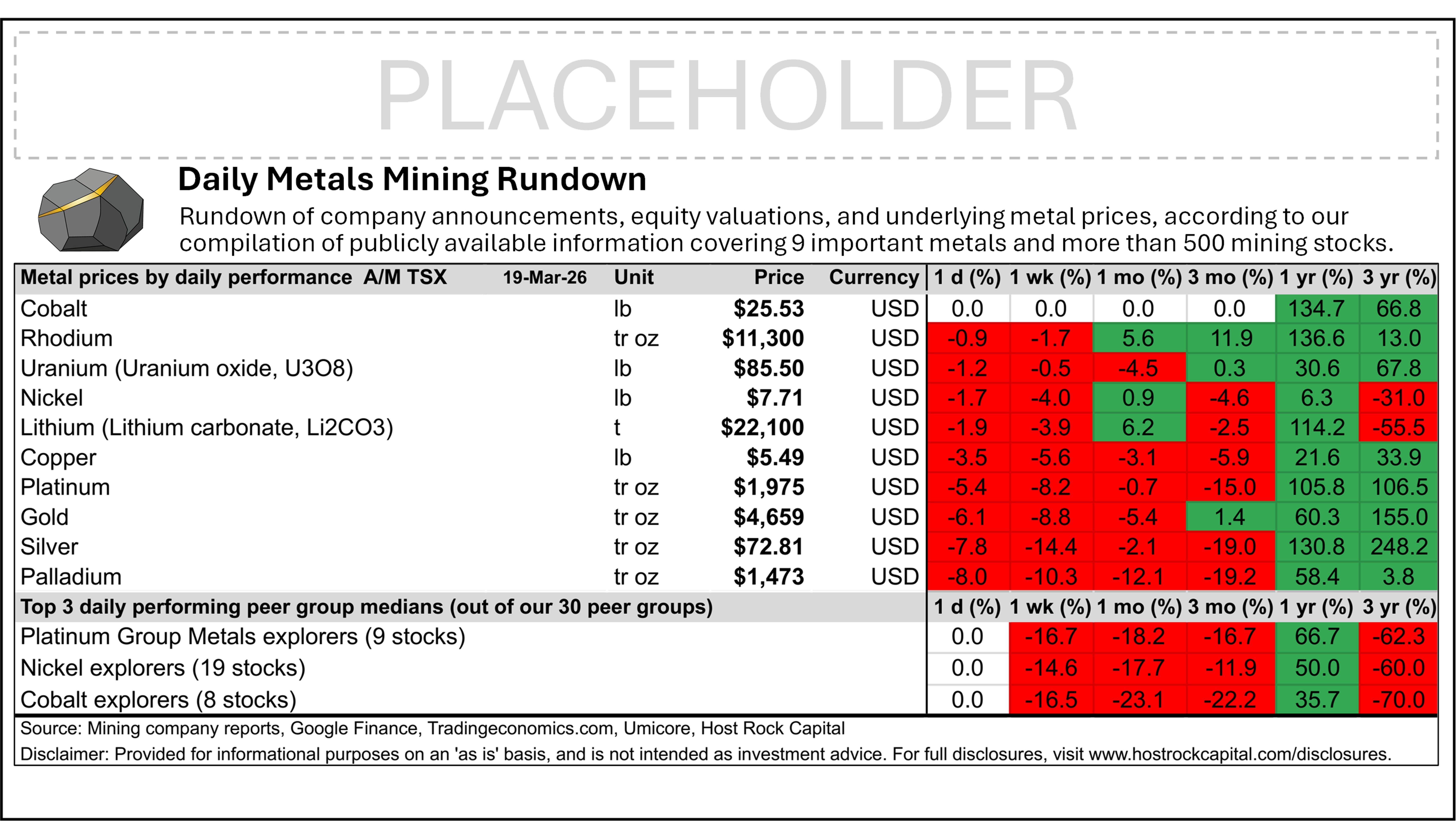 Includes: the same information provided in the Free Daily Metals Mining Rundown (metals pricing, peer group median price performance, peer group median valuations, and list of top and bottom 40 daily performing stocks showing associated peer groups), in addition to premium items such as the lists of individual stocks making up each peer group and their relative price performances, along with ranked valuation information (by market cap per unit resource for all 450+ stocks, and by P/NAV for 150+ developer stocks). Published and distributed up to twice daily, 3-5 days per week. Upgrade to a paid tier is required for access. For legal disclosures, visit www.hostrockcapital.com/disclosures.
