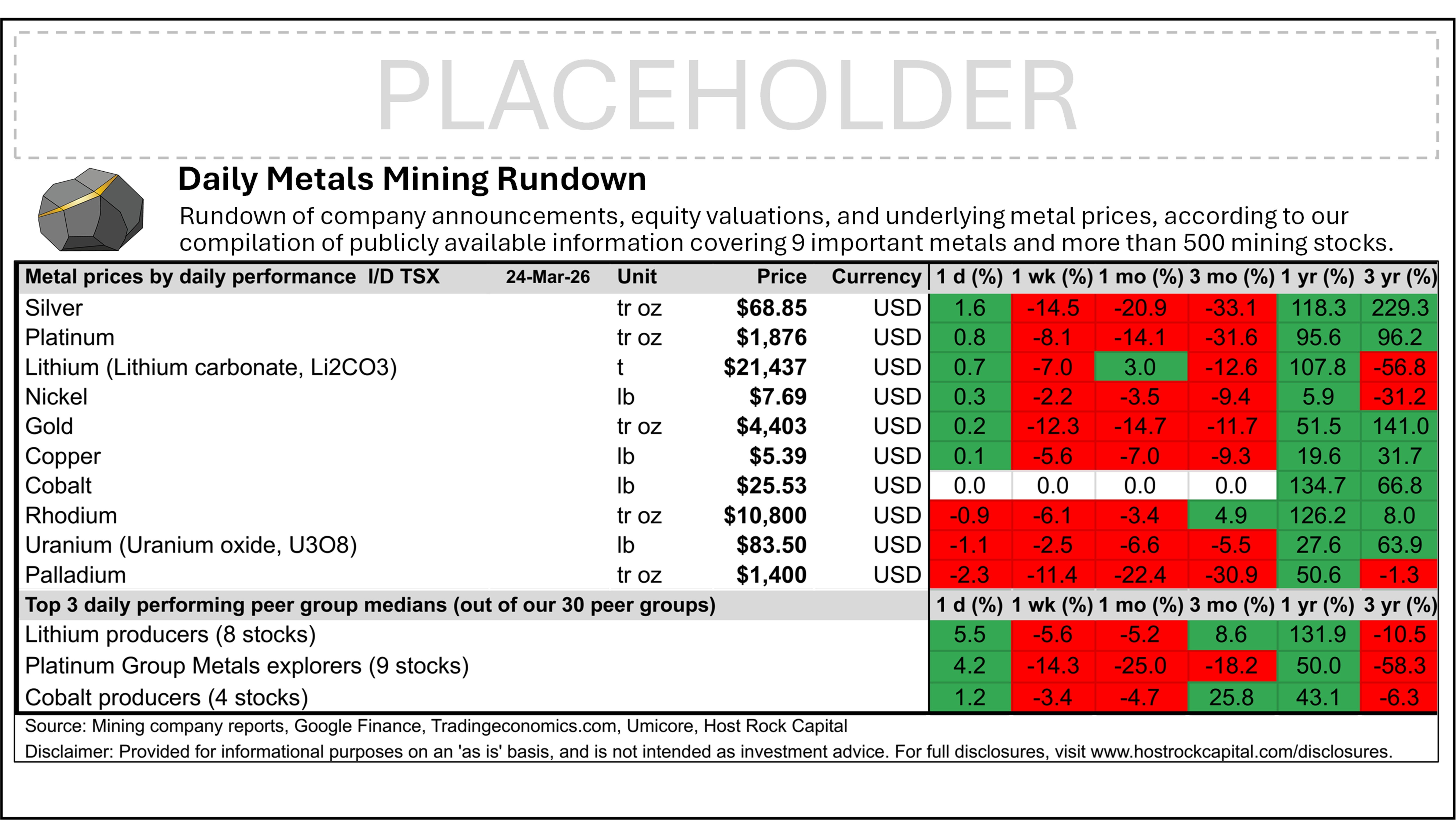 Includes: the same information provided in the Free Daily Metals Mining Rundown (metals pricing, peer group median price performance, peer group median valuations, and list of top and bottom 40 daily performing stocks showing associated peer groups), in addition to premium items such as the lists of individual stocks making up each peer group and their relative price performances, along with ranked valuation information (by market cap per unit resource for all 450+ stocks, and by P/NAV for 150+ developer stocks). Published and distributed up to twice daily, 3-5 days per week. Upgrade to a paid tier is required for access. For legal disclosures, visit www.hostrockcapital.com/disclosures.