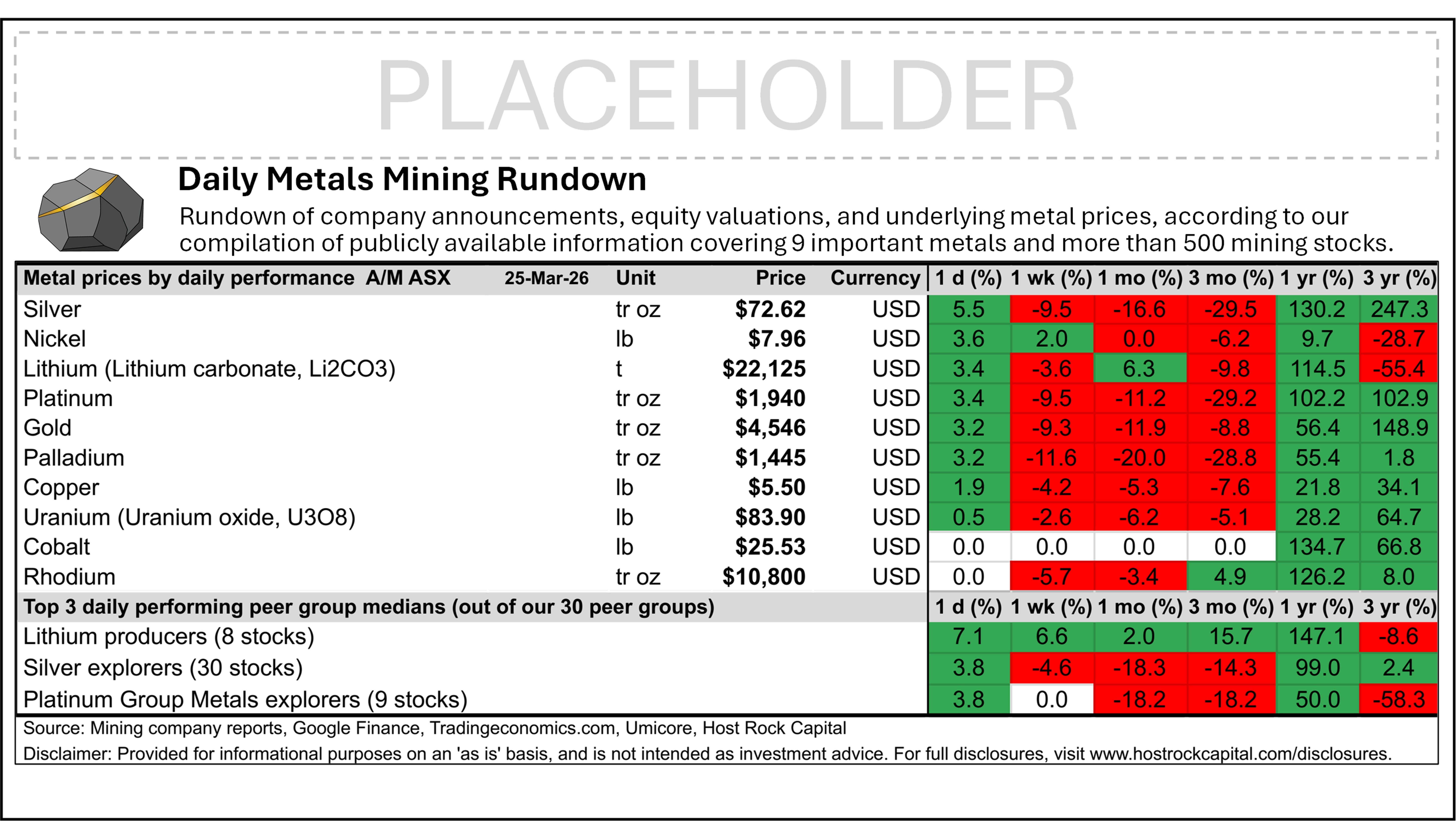 Includes: the same information provided in the Free Daily Metals Mining Rundown (metals pricing, peer group median price performance, peer group median valuations, and list of top and bottom 40 daily performing stocks showing associated peer groups), in addition to premium items such as the lists of individual stocks making up each peer group and their relative price performances, along with ranked valuation information (by market cap per unit resource for all 450+ stocks, and by P/NAV for 150+ developer stocks). Published and distributed up to twice daily, 3-5 days per week. Upgrade to a paid tier is required for access. For legal disclosures, visit www.hostrockcapital.com/disclosures.