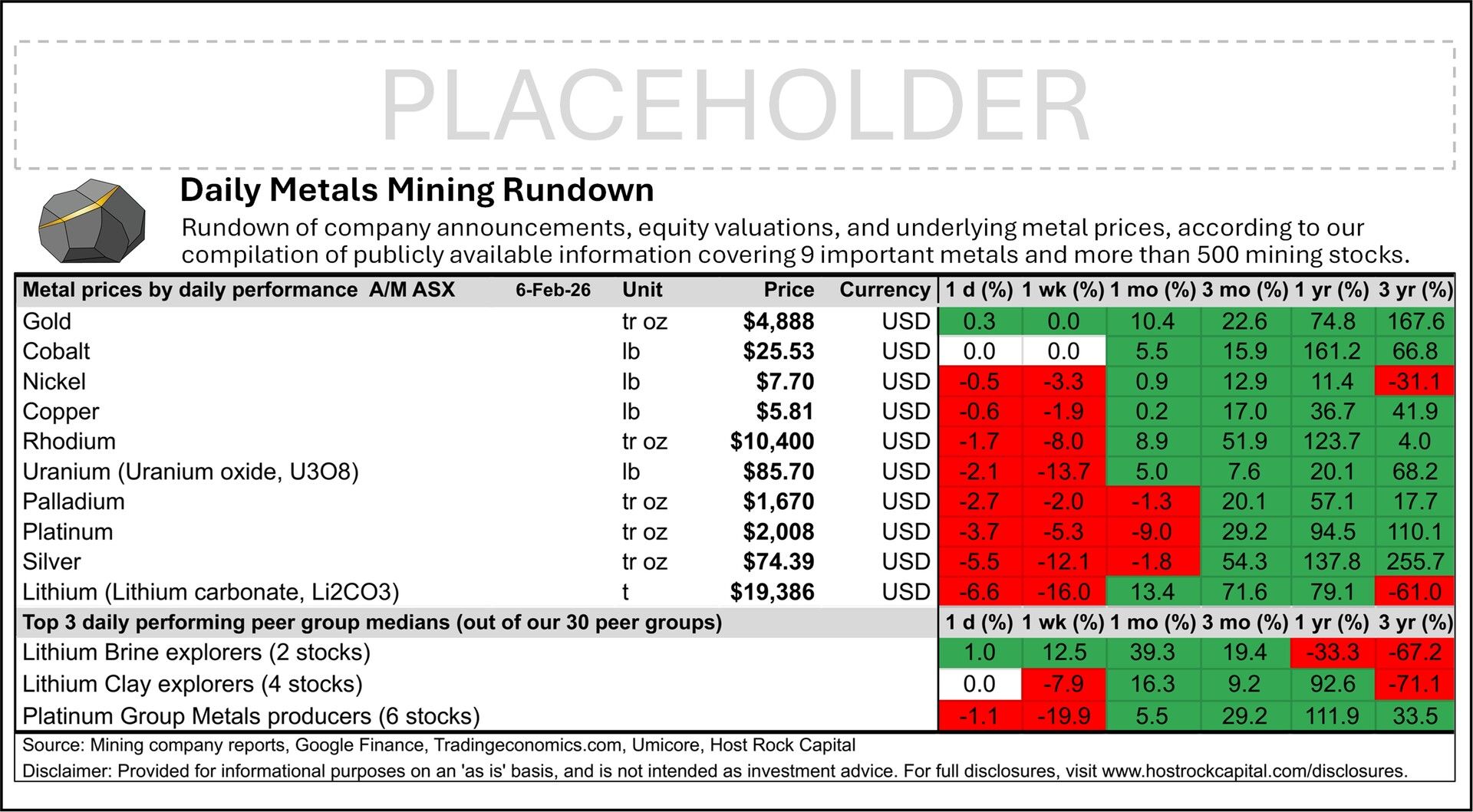 Includes: the same information provided in the Free Daily Metals Mining Rundown (metals pricing, peer group median price performance, peer group median valuations, and list of top and bottom 40 daily performing stocks showing associated peer groups), in addition to premium items such as the lists of individual stocks making up each peer group and their relative price performances, along with ranked valuation information (by market cap per unit resource for all 450+ stocks, and by P/NAV for 150+ developer stocks). Published and distributed up to twice daily, 3-5 days per week. Upgrade to a paid tier is required for access. For legal disclosures, visit www.hostrockcapital.com/disclosures.