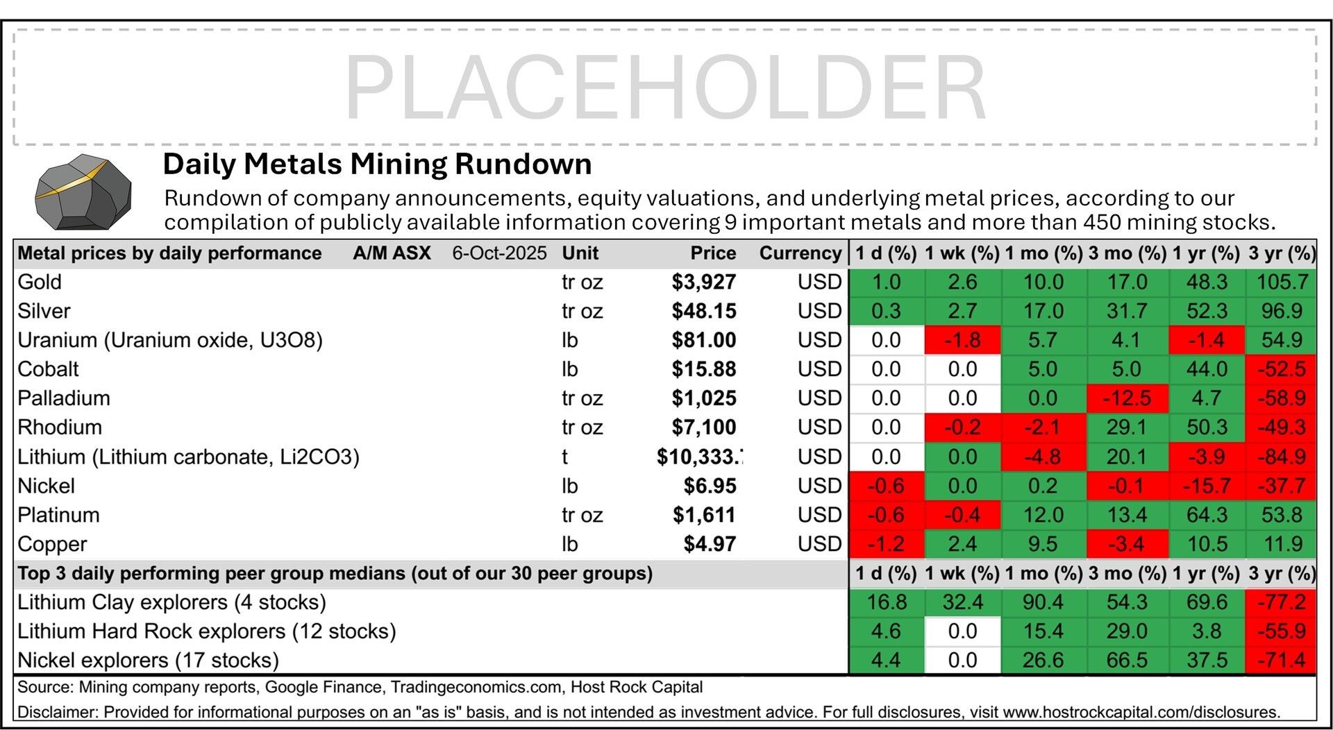 Daily Metals Mining Rundown with Peer Table - Premium Edition for 6 Oct 2025 (after-market ASX)